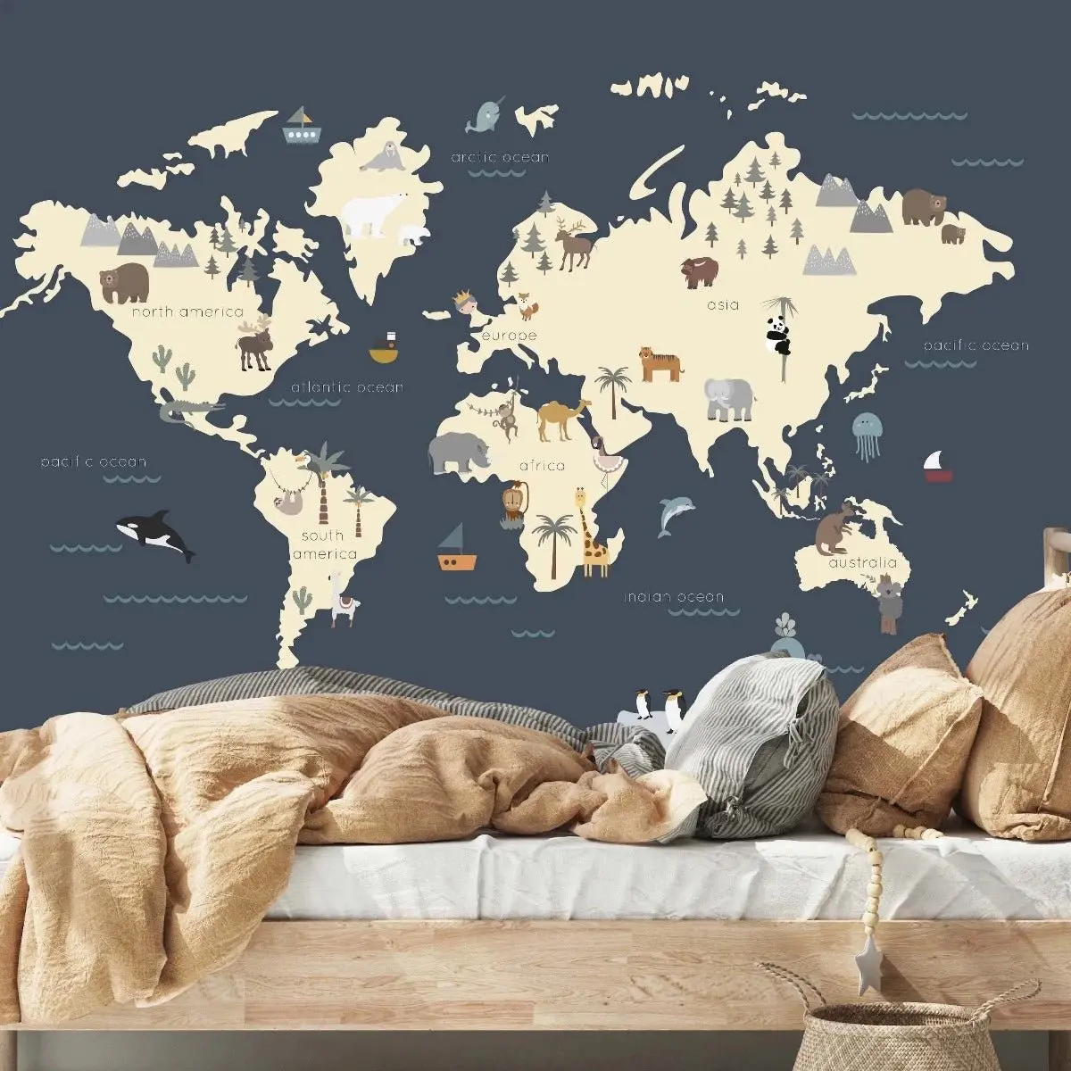 Transformez votre mur en une carte exotique grâce à ce papier peint plein de personnages Munks and Me en bleu marine !